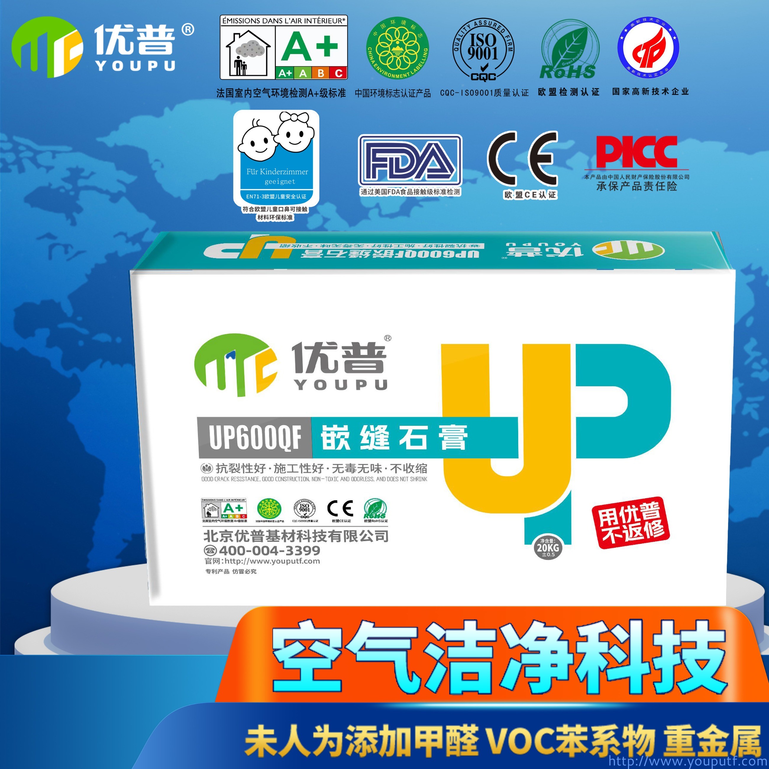 優普嵌縫石膏,由精細的天然石膏粉加入計量膠粘劑配置而成,綠色環保,歐洲標準,零醛零VOC,通過法國A+認證。